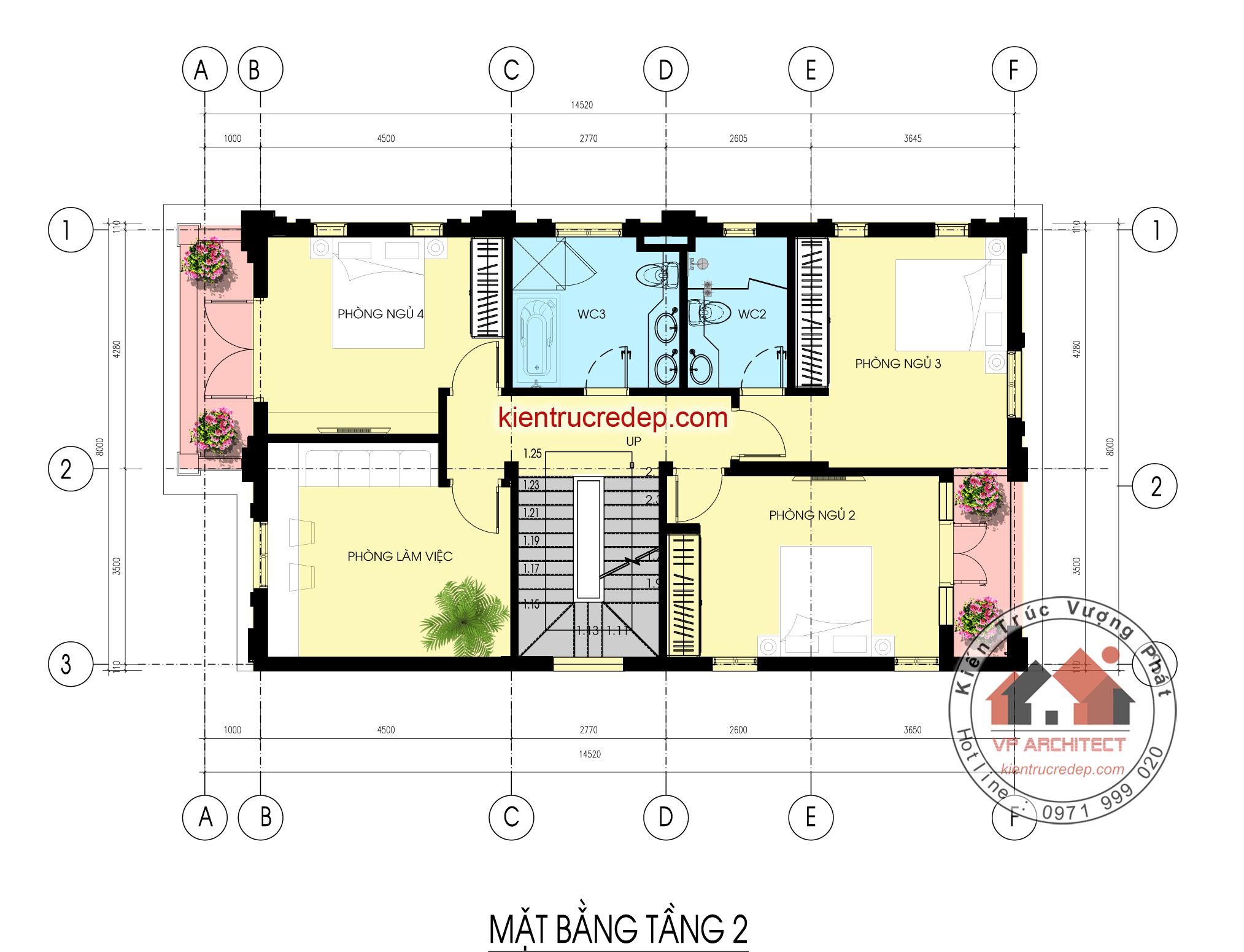 Tầng 2 : 3 phòng ngủ + 1 phòng làm việc + 2 WC
