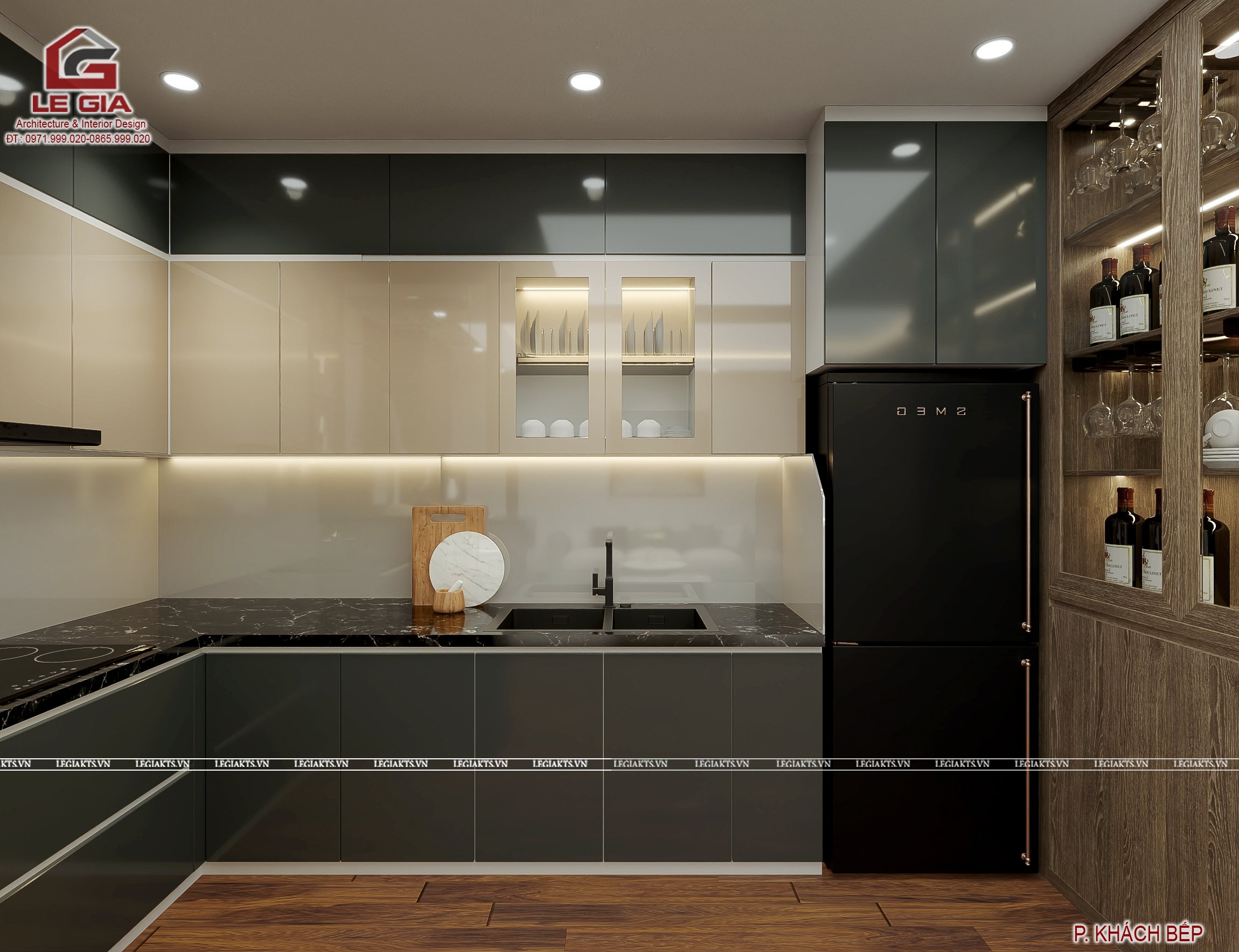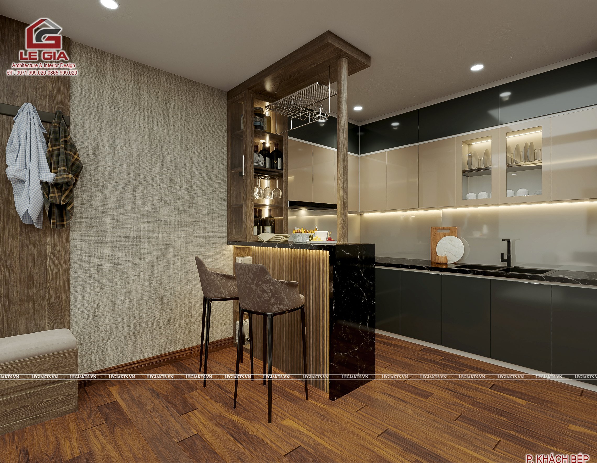 Phòng bếp: tủ bếp kịch trần dài chữ L kết hợp quầy bar