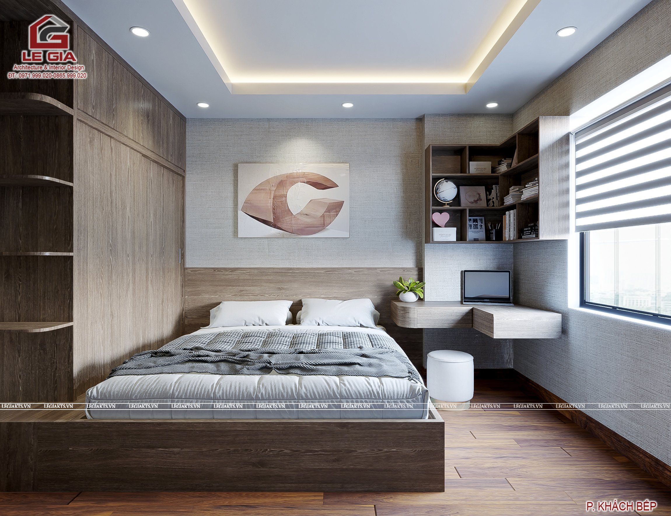 - Bàn làm việc và giá sách rộng cạnh cửa sổ lấy ánh sáng tự nhiên