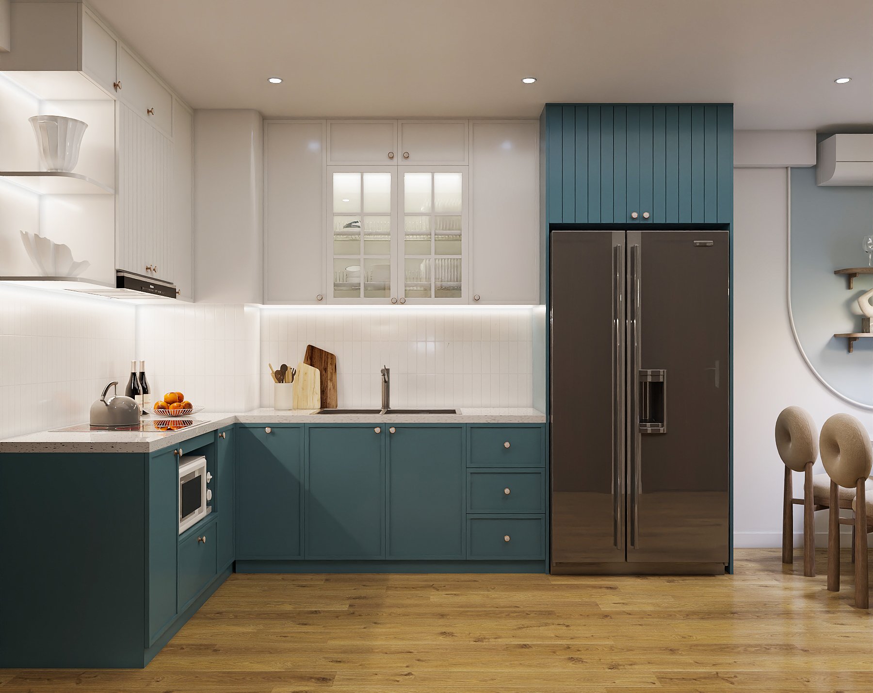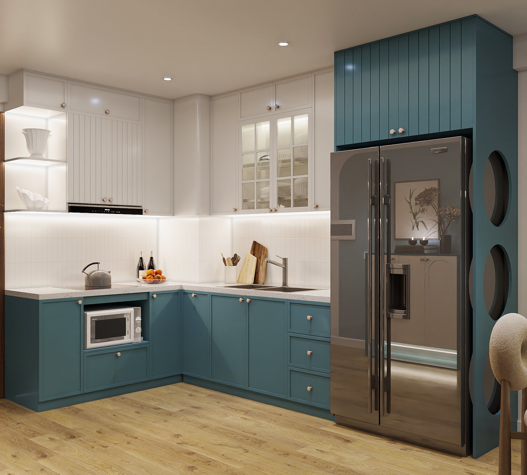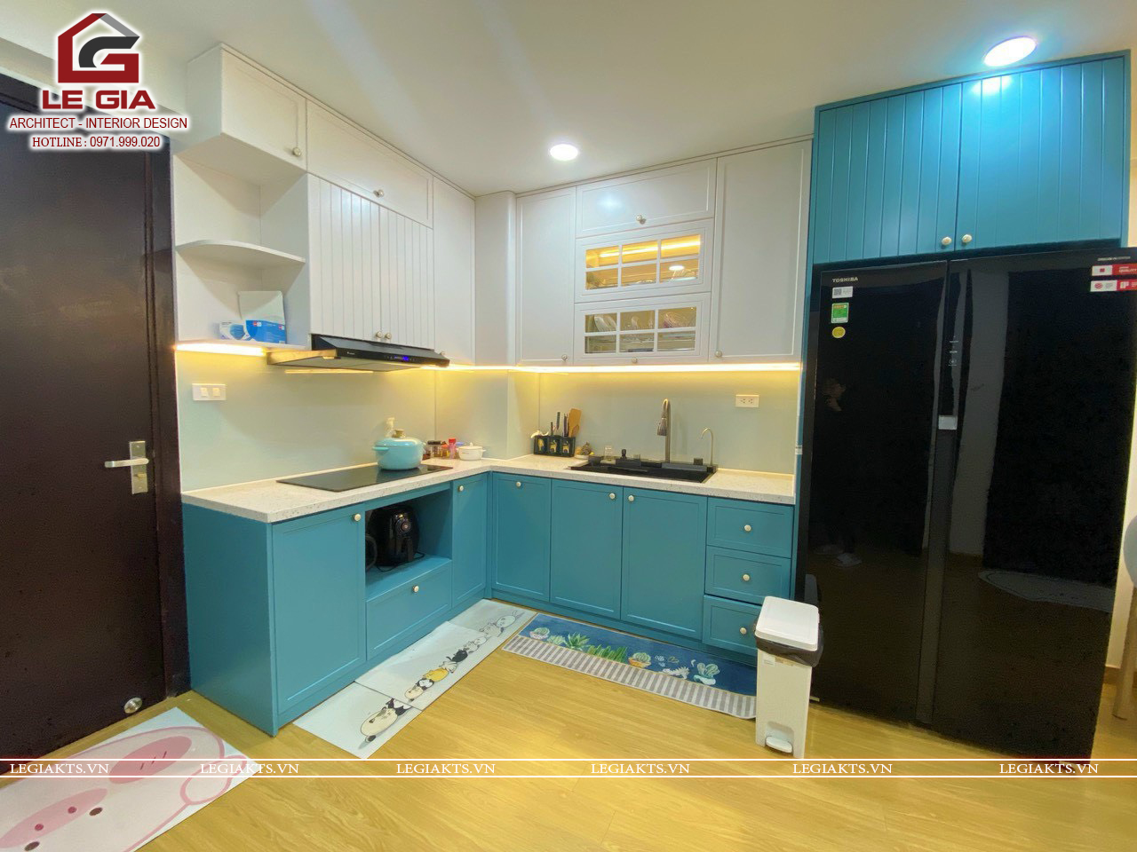 Phòng bếp: tủ bếp kịch trần dài chữ L kết hợp hộp bao tủ lạnh