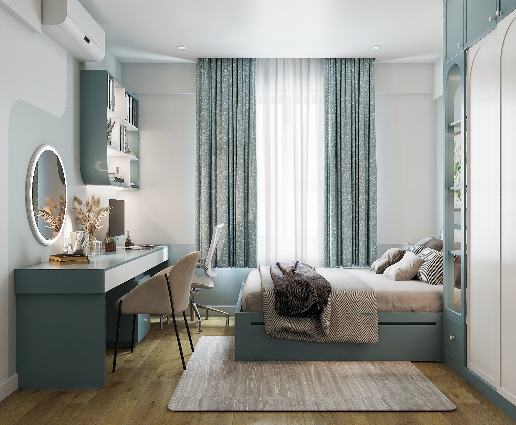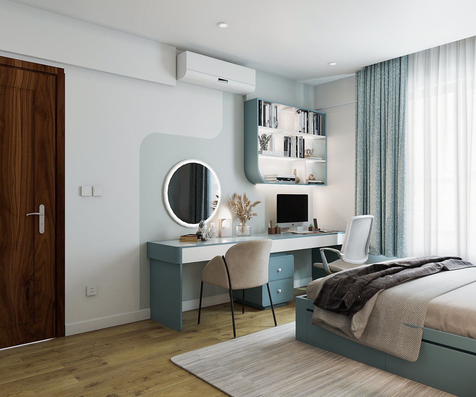 Phòng ngủ chính: gồm giường 1.8*2m có 2 ngăn kéo, bàn làm việc kết hợp bàn phấn dài, 1 tủ quần áo