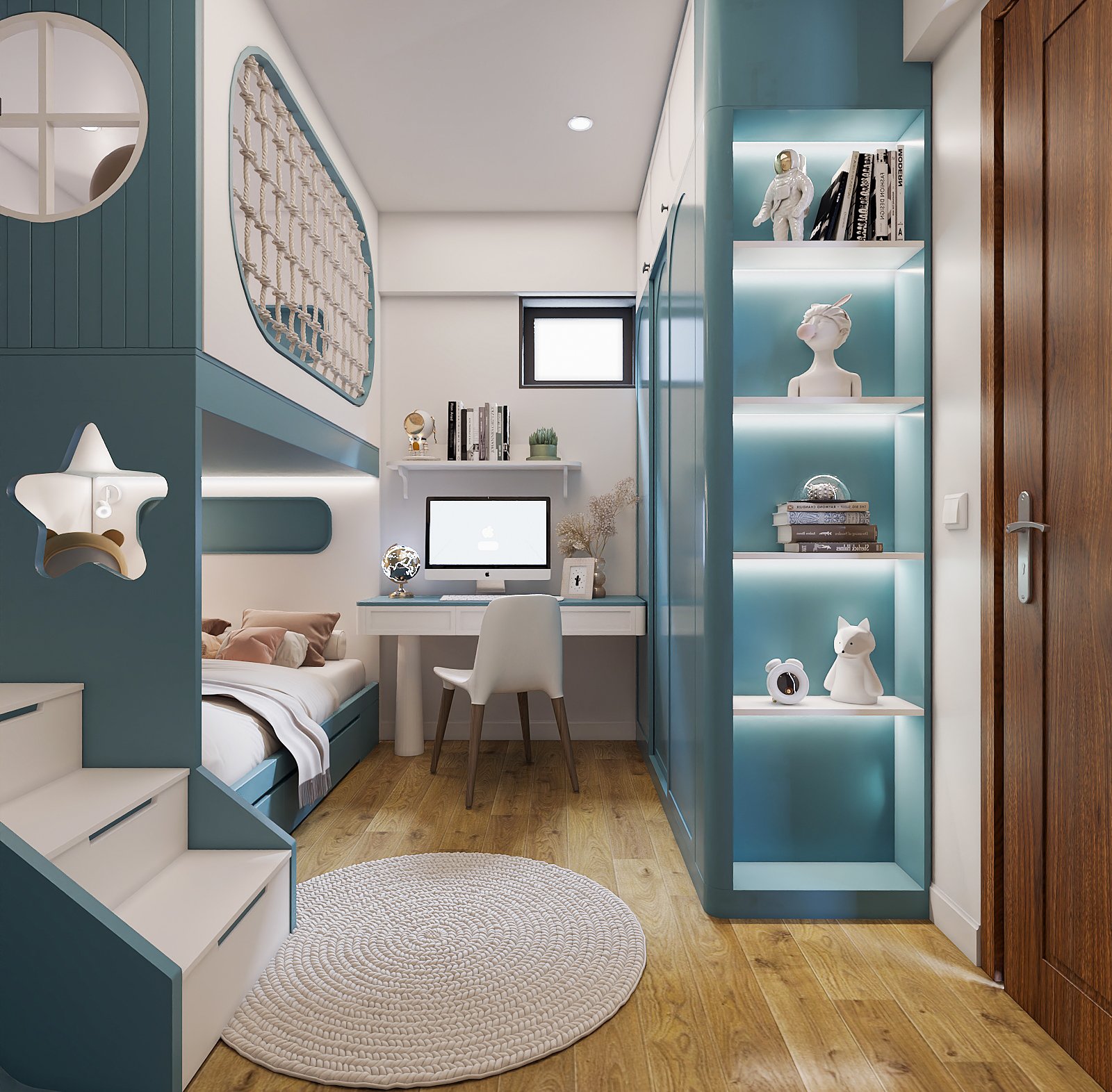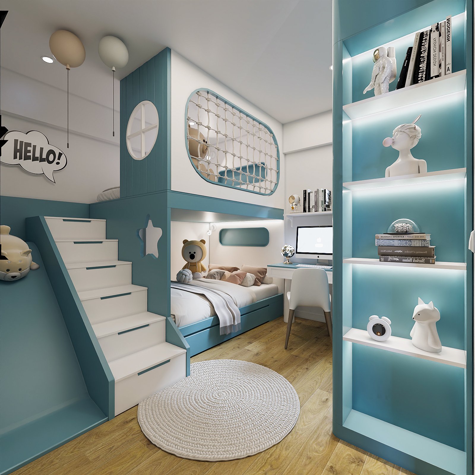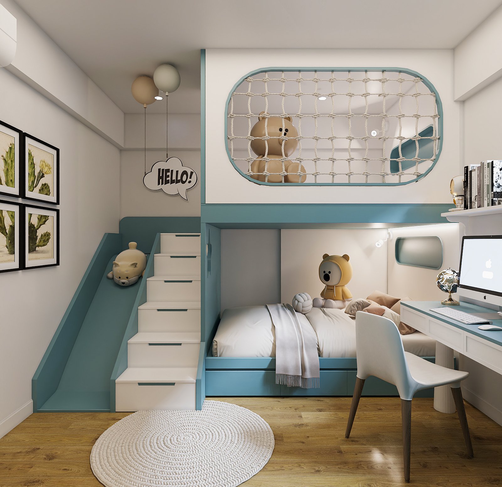 Phòng ngủ bé: giường tầng kết hợp cầu trượt giúp bé thỏa sức hoạt động và sáng tạo.