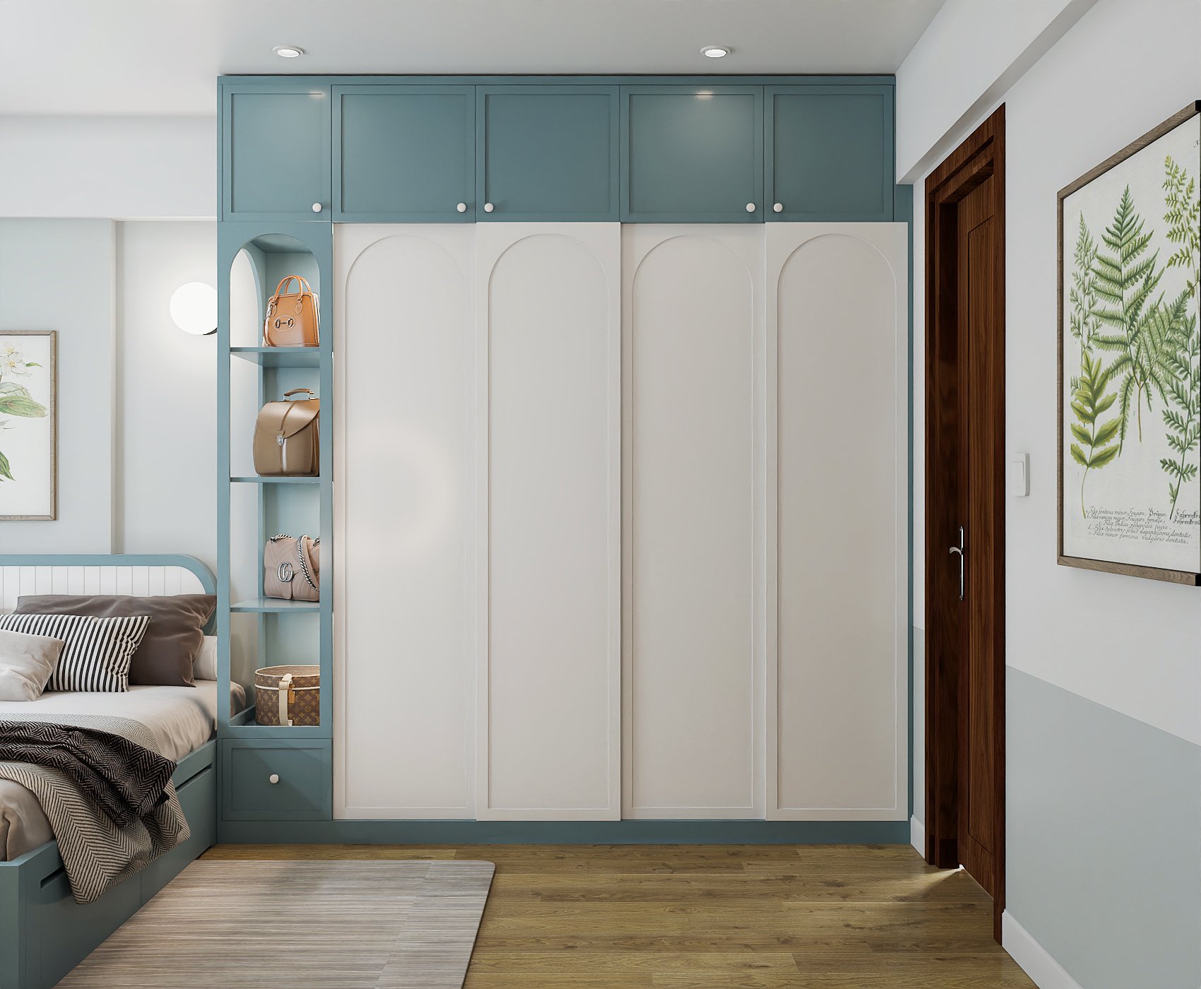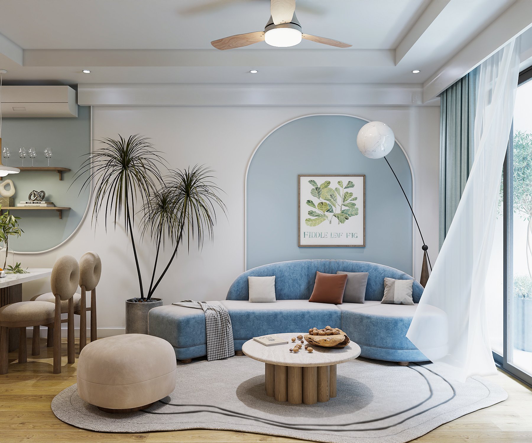 Sofa nỉ nhung sau là chỉ tường PU trắng sơn xanh đổi màu vừa tạo điểm nhấn lại tiết kiệm chi phí.