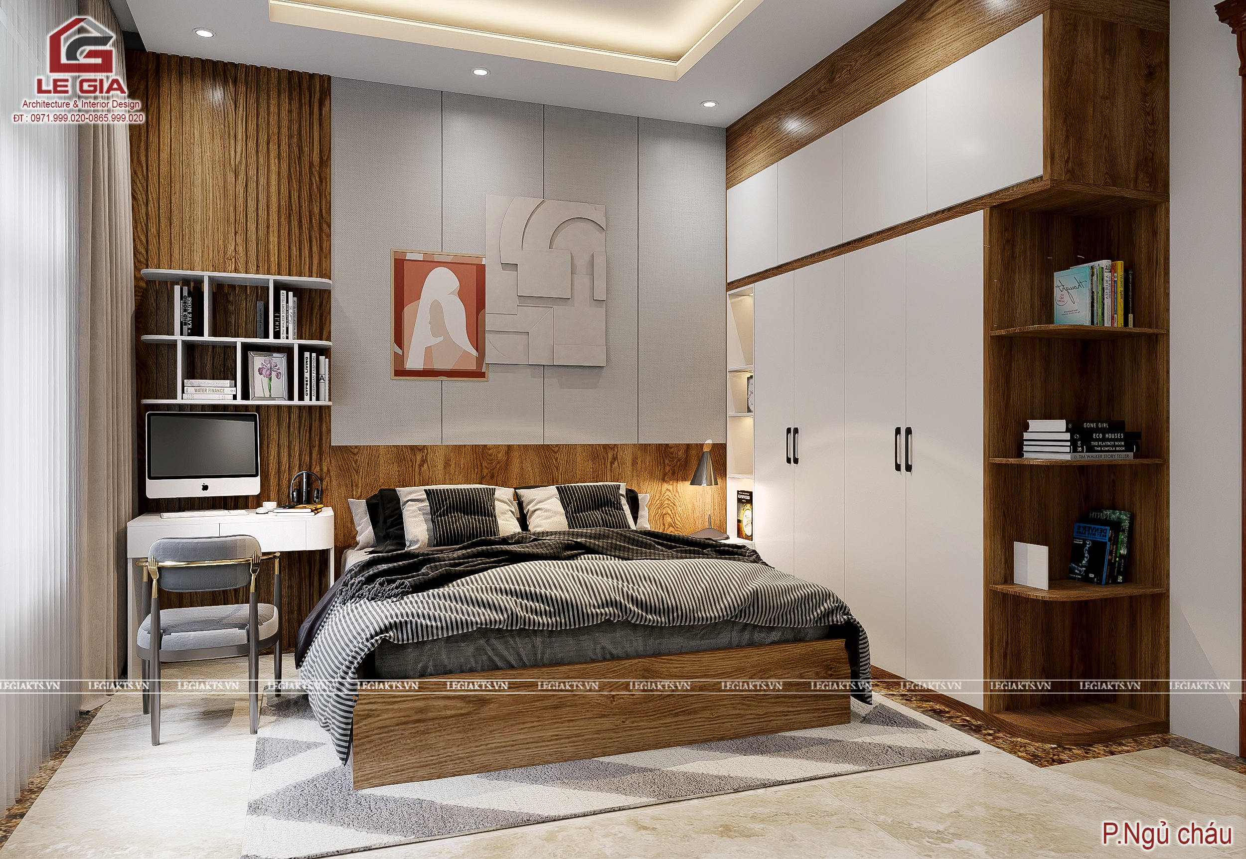4. Phòng ngủ cháu: gồm giường ngủ 1.8*2m 1 bàn học và giá sách, 1 tủ quần áo trang trí thêm vách gỗ sau giường tạo điểm nhấn