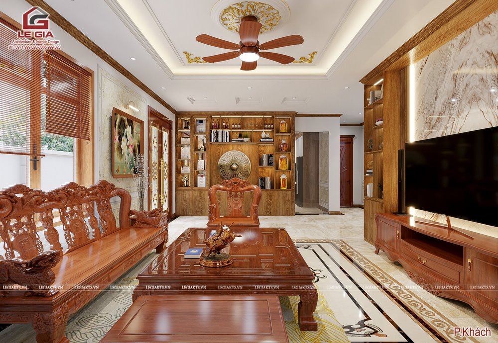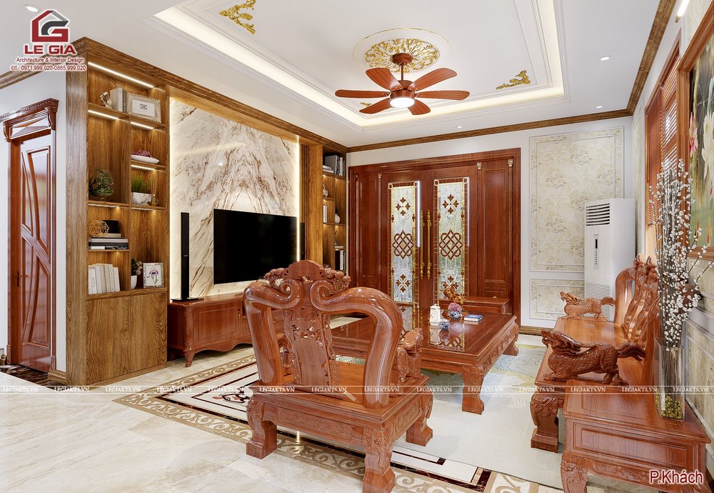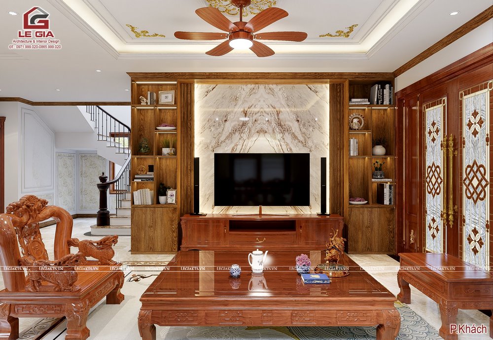 1. Phòng khách rộng với bộ bàn ghế gỗ to, kệ tivi gỗ tự nhiên. Hệ tủ trang trí hai bên tivi kết hợp vách PVC giả đá dán trên nền cốt min hàng đặt in theo yêu cầu.