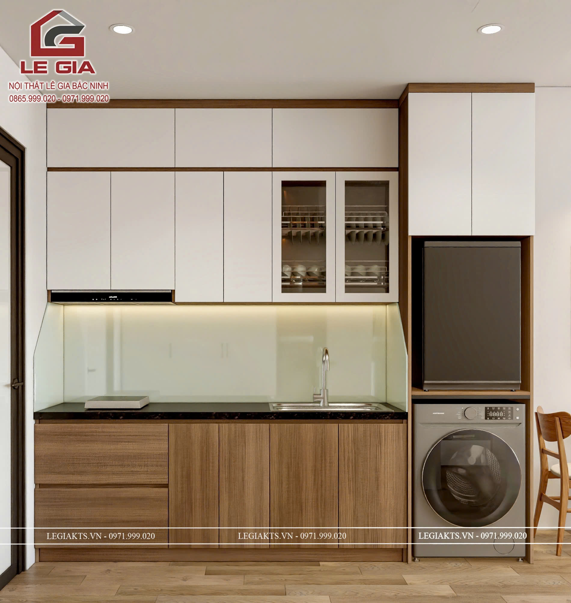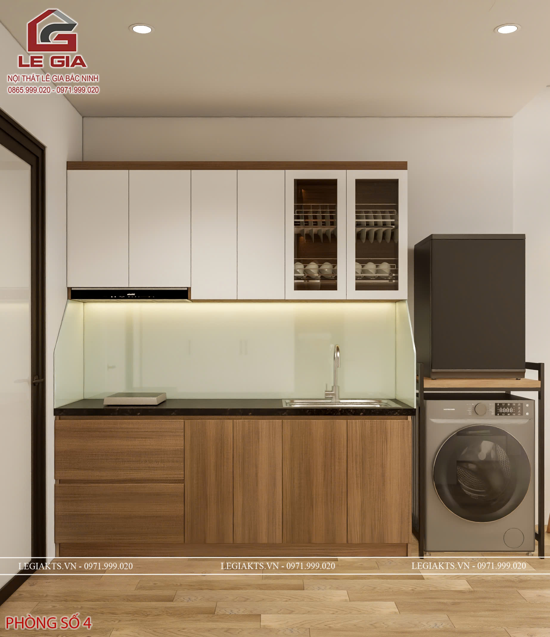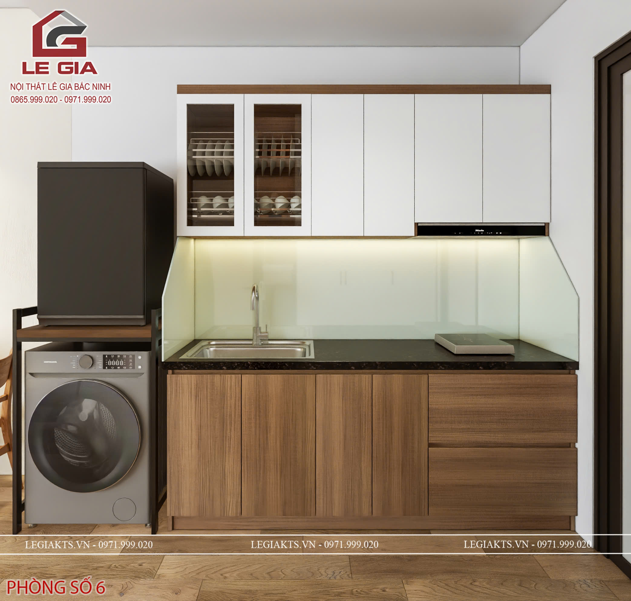 Phòng số 1,2,3 có bố cục giống nhau: tủ bếp cao kịch trần với đầy đủ công năng giá bát, giá dao, giá xoong nồi.