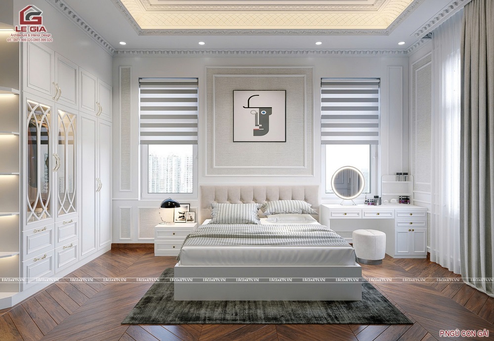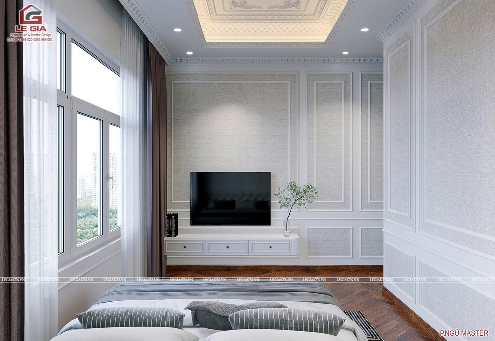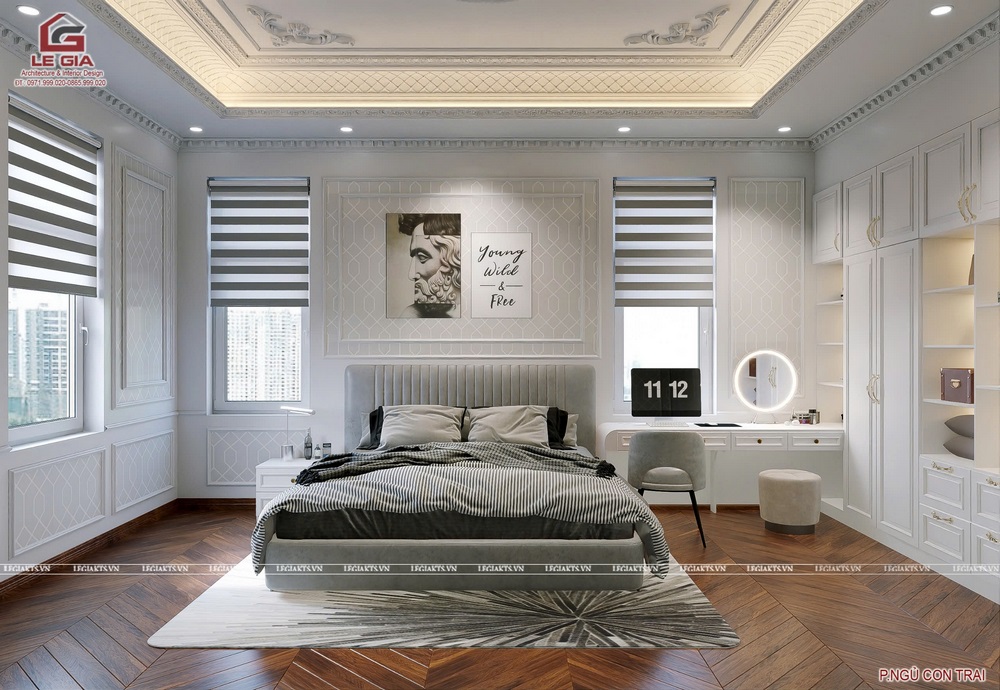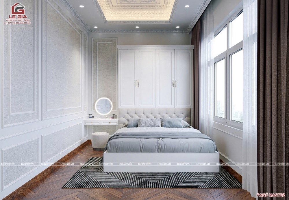 Phòng ngủ Master gồm giường 2*2.2m bọc da rút múi đầu giường, bàn phấn và tủ quần áo sơn Inchem