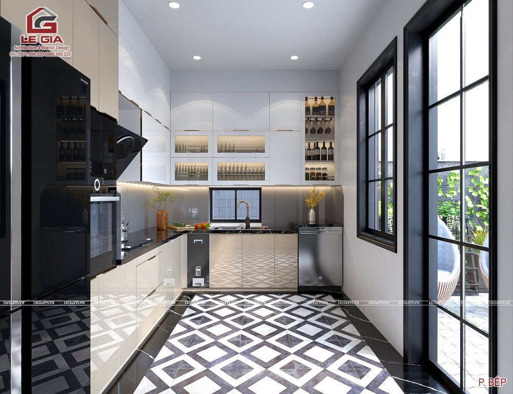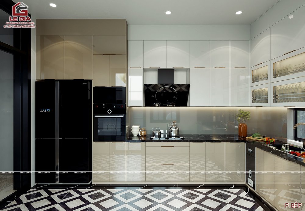 Phòng bếp: tủ bếp chữ L cao lịch trần chất liệu inox cánh kính cường lực viền nhôm Anode cao cấp