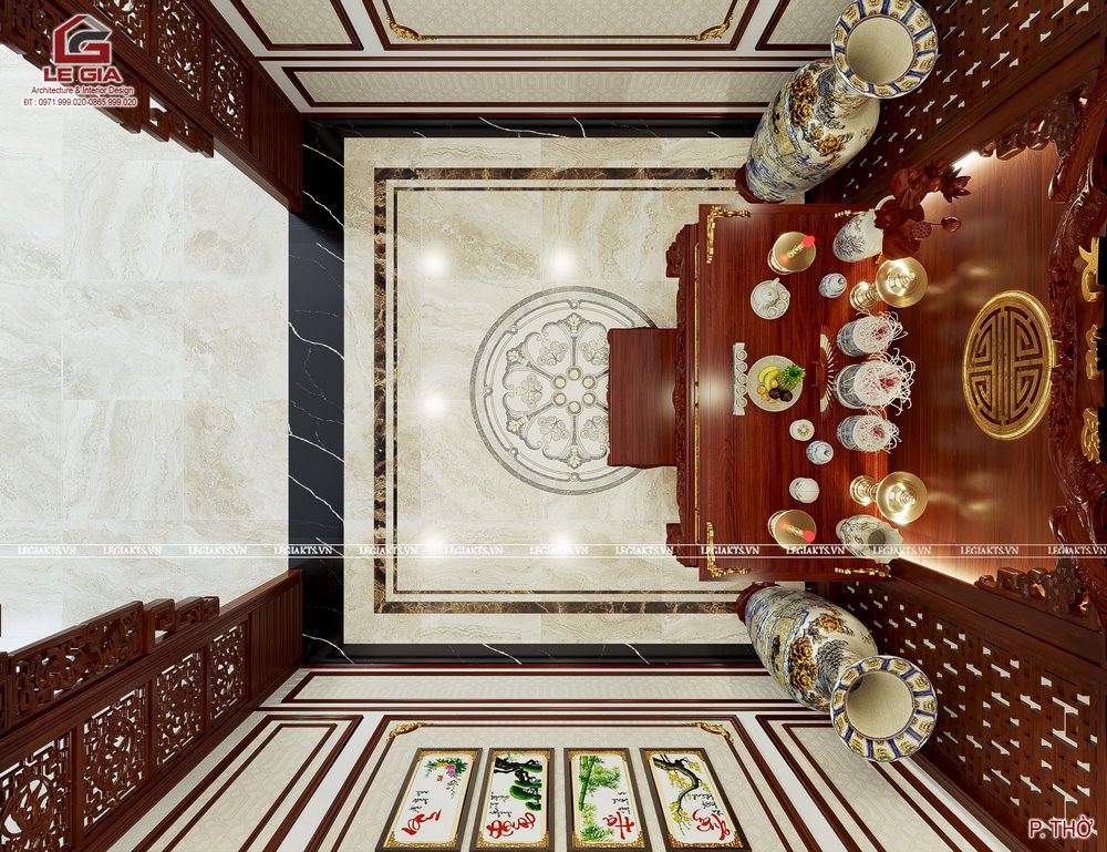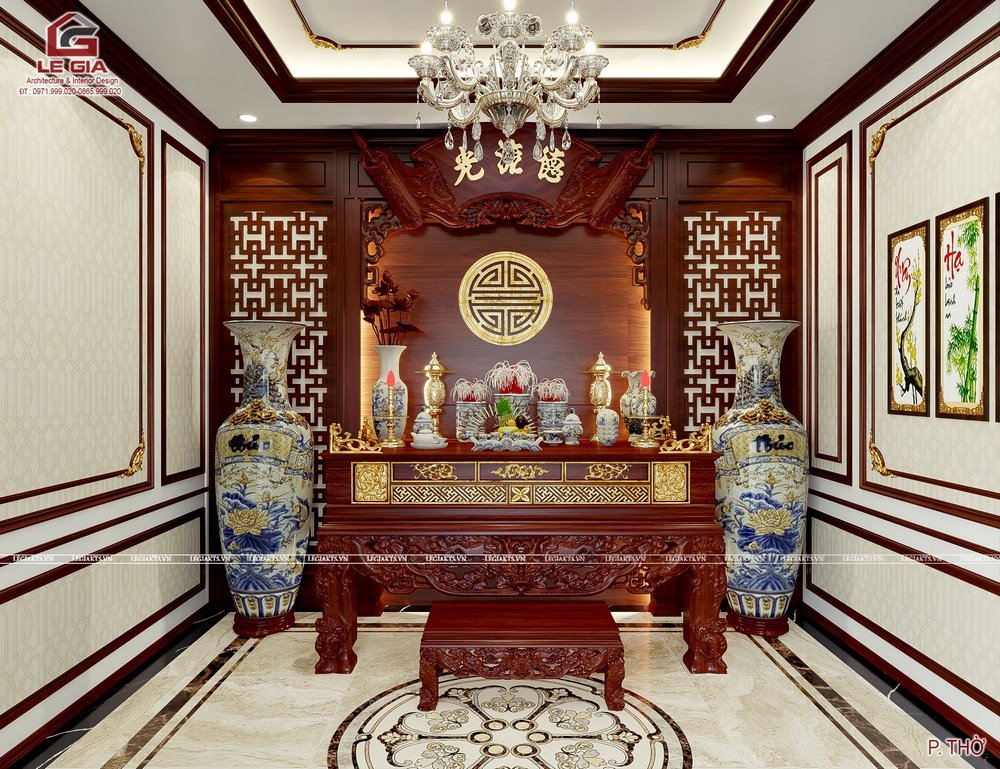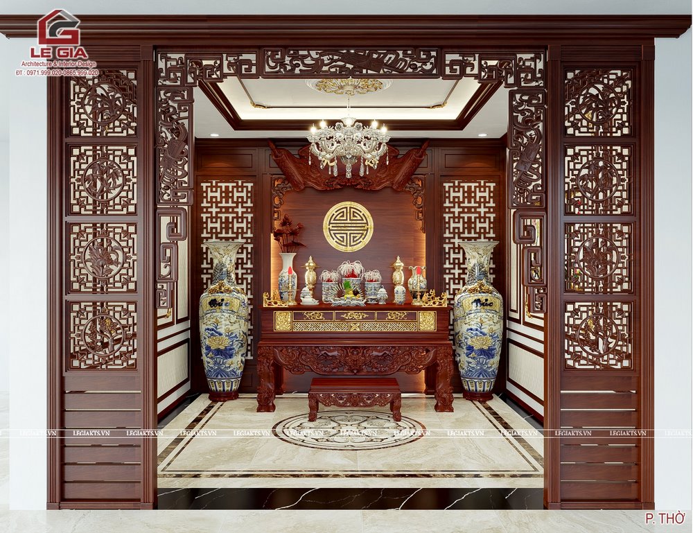 Bên trong ban thờ là vách gỗ kết hợp vách cnc chất liệu gỗ Gõ đỏ Pachy, chạy phào gỗ xung quanh trần.