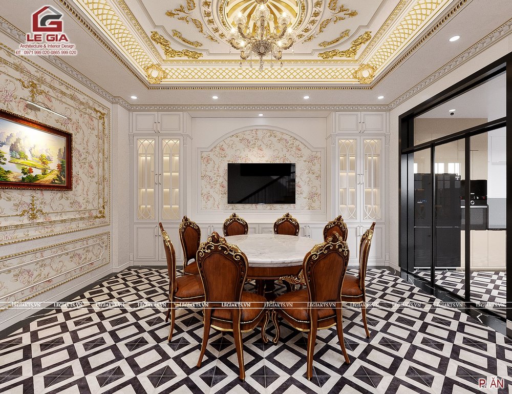 Khu vực phòng ăn gồm bàn ăn tròn mặt đá thạch anh cao cấp và 8 ghế. Tủ kệ tivi trang trí đi led âm tủ tạo điểm nhấn