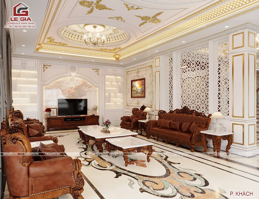 Khu vực phòng khách trần giật cấp chất liệu picomat dát vàng khung xương inox cao cấp. Vách trang trí sau kệ tivi là PVC giả đá đặt in theo yêu cầu tạo hốc đi led âm hắt sáng. Hai bên tủ là gỗ MDF cốt xanh chống ẩm phun sơn Inchem của mỹ, cánh soi chỉ tạo điểm nhấn và mềm mại hút mắt người nhìn hơn.