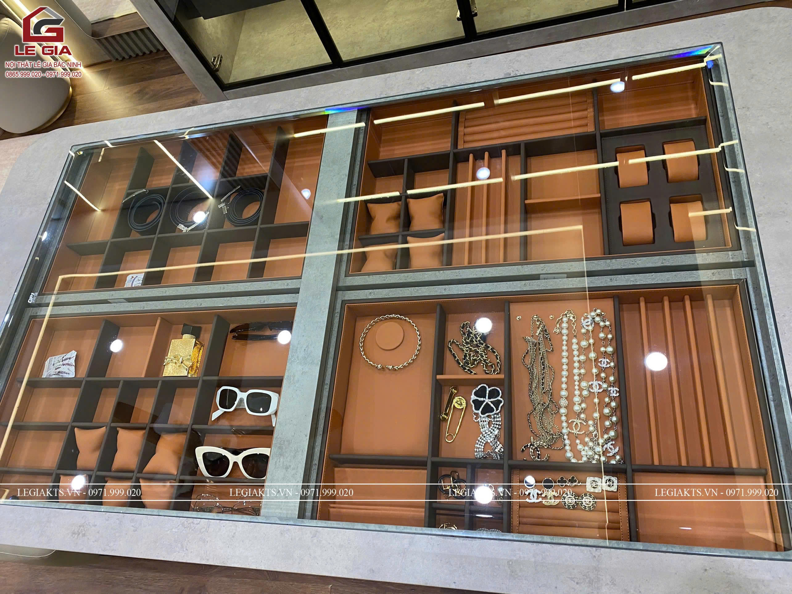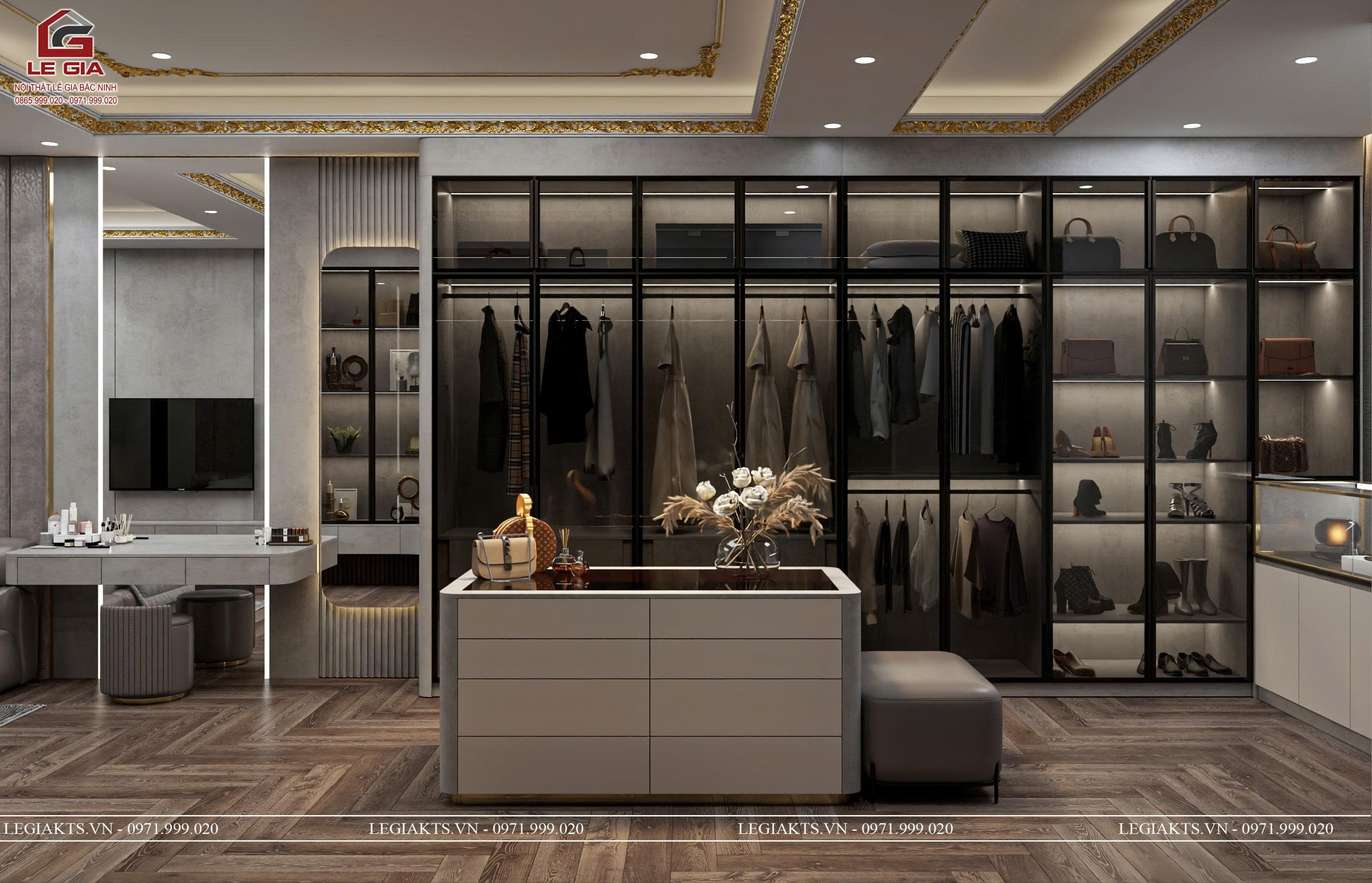 Bàn đảo phụ kiện sang trọng – như một “boutique thu nhỏ” trong phòng ngủ, vừa lưu trữ vừa trưng bày tinh tế.