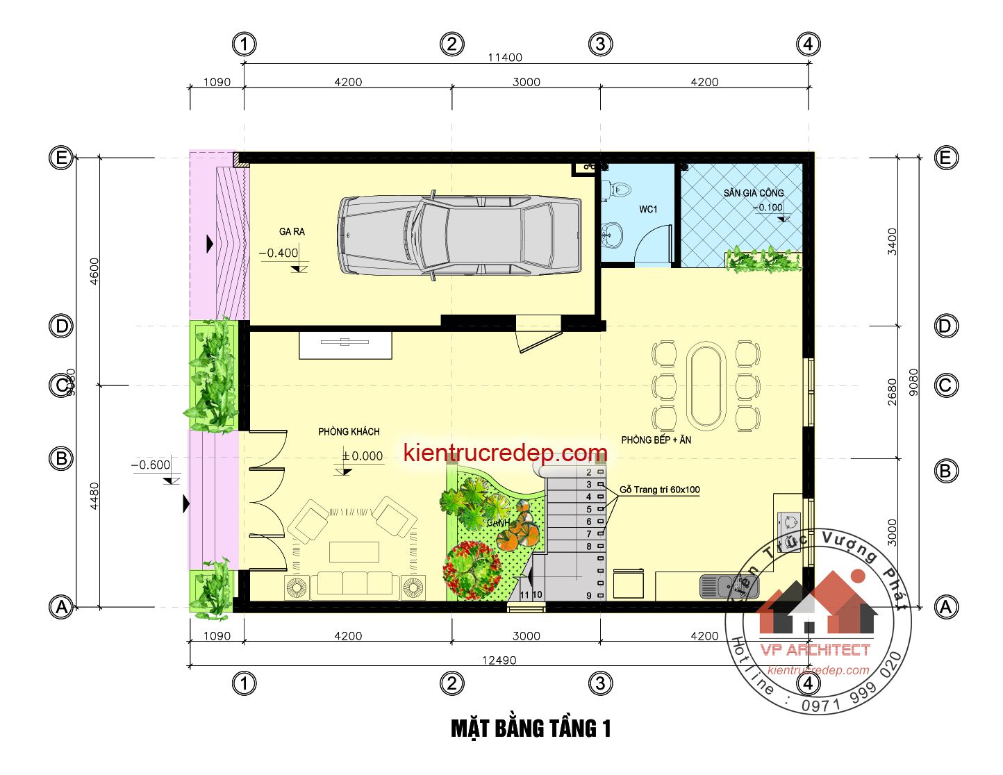 Tầng 1 : 1 phòng khách + 1 gara + 1 phòng bếp + 1 phòng ăn + 1 WC và sân gia công