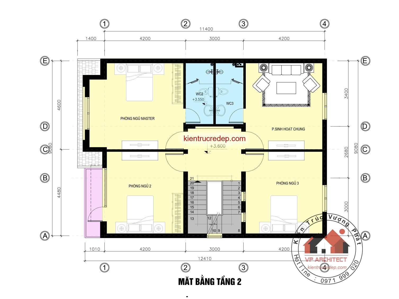 Tầng 2 : 3 phòng ngủ + 1 phòng sinh hoạt chung + 2 WC
