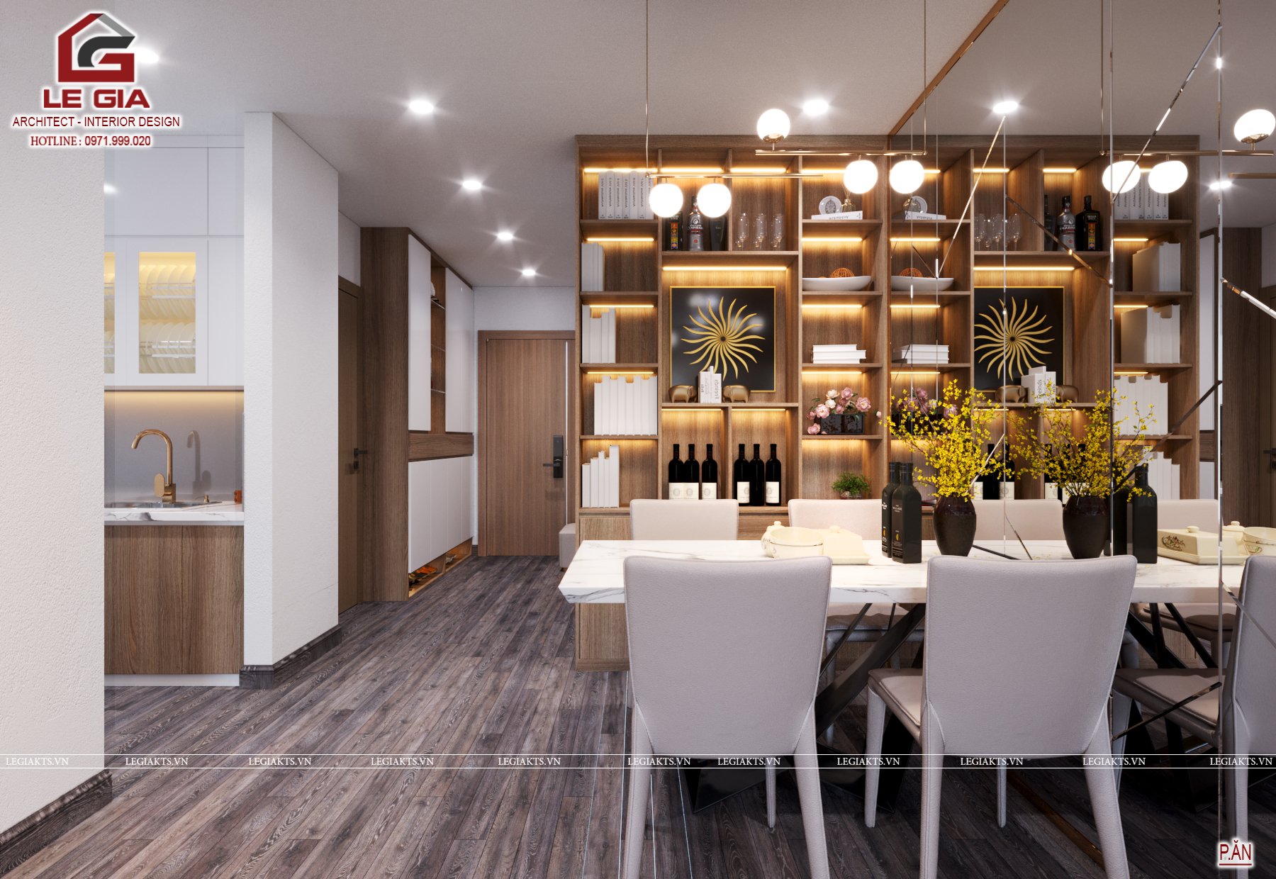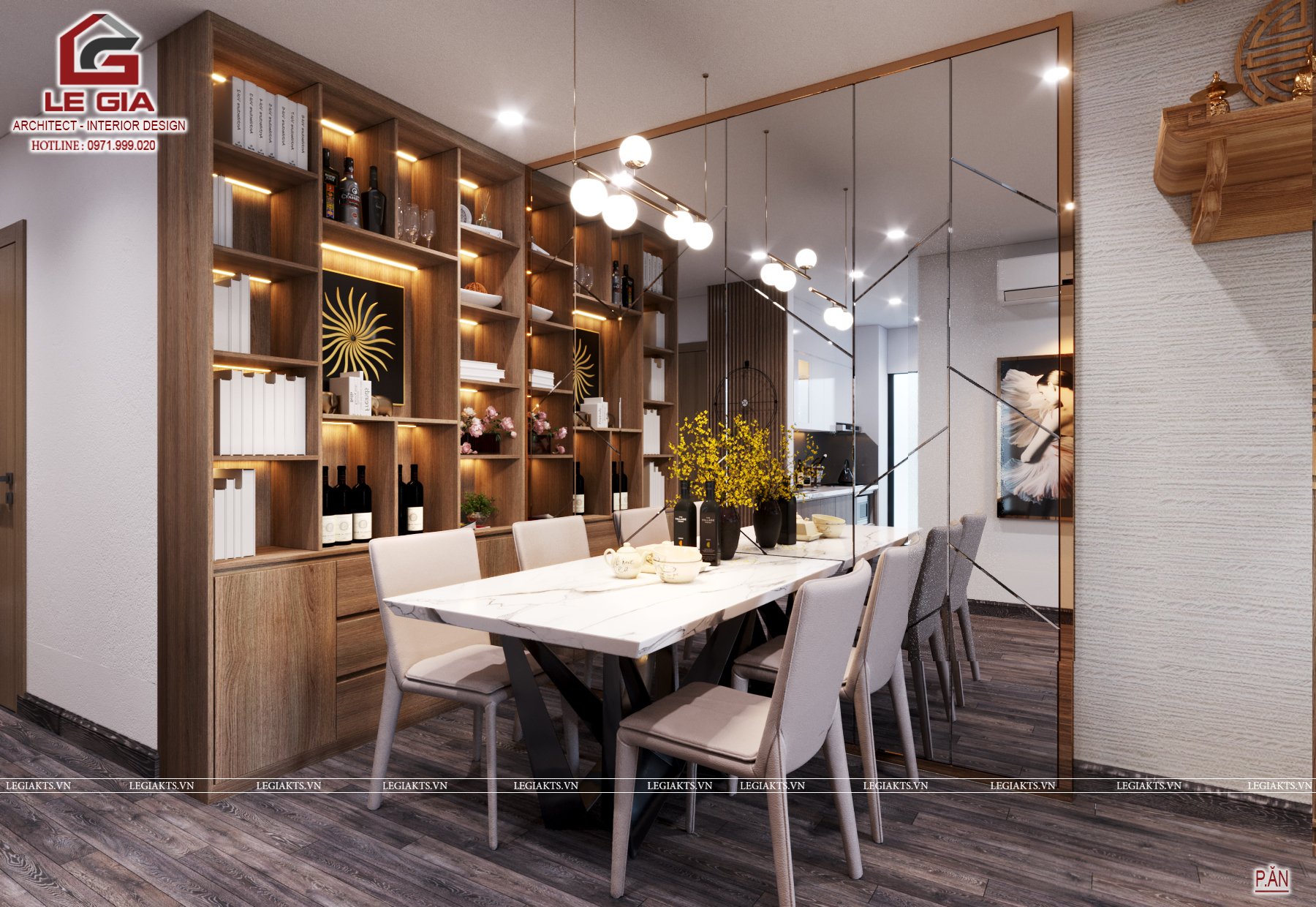 Không gian phòng ăn được thiết kế thêm tủ rượu có chạy đèn led tạo hiệu ứng. Vách gương cạnh bàn ăn đánh lừa thị giác giúp không gian rộng hơn.