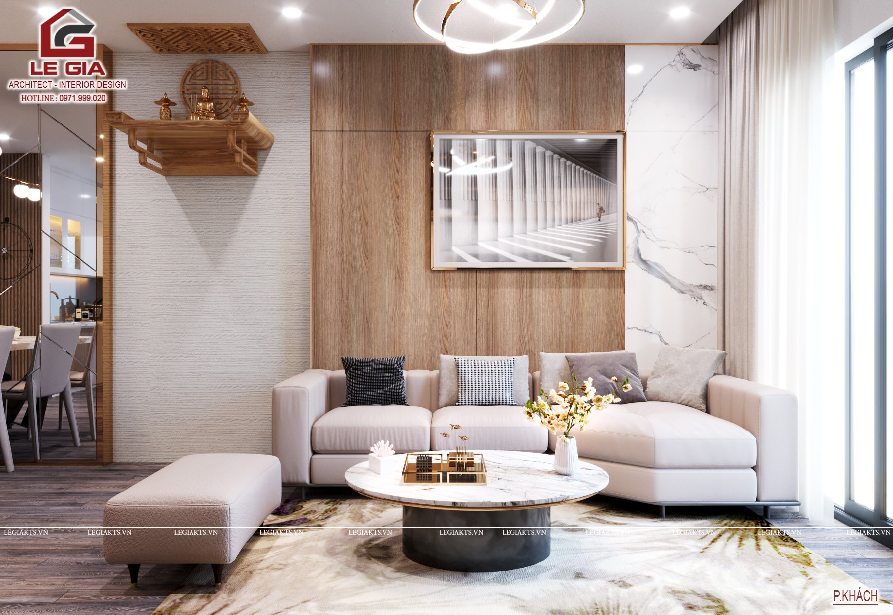 Phòng khách bao gồm bộ sofa hàng đặt theo thiết kế bàn trà hàng nhập khẩu, các mảng tường được trang trí tạo điểm nhấn cho không gian.