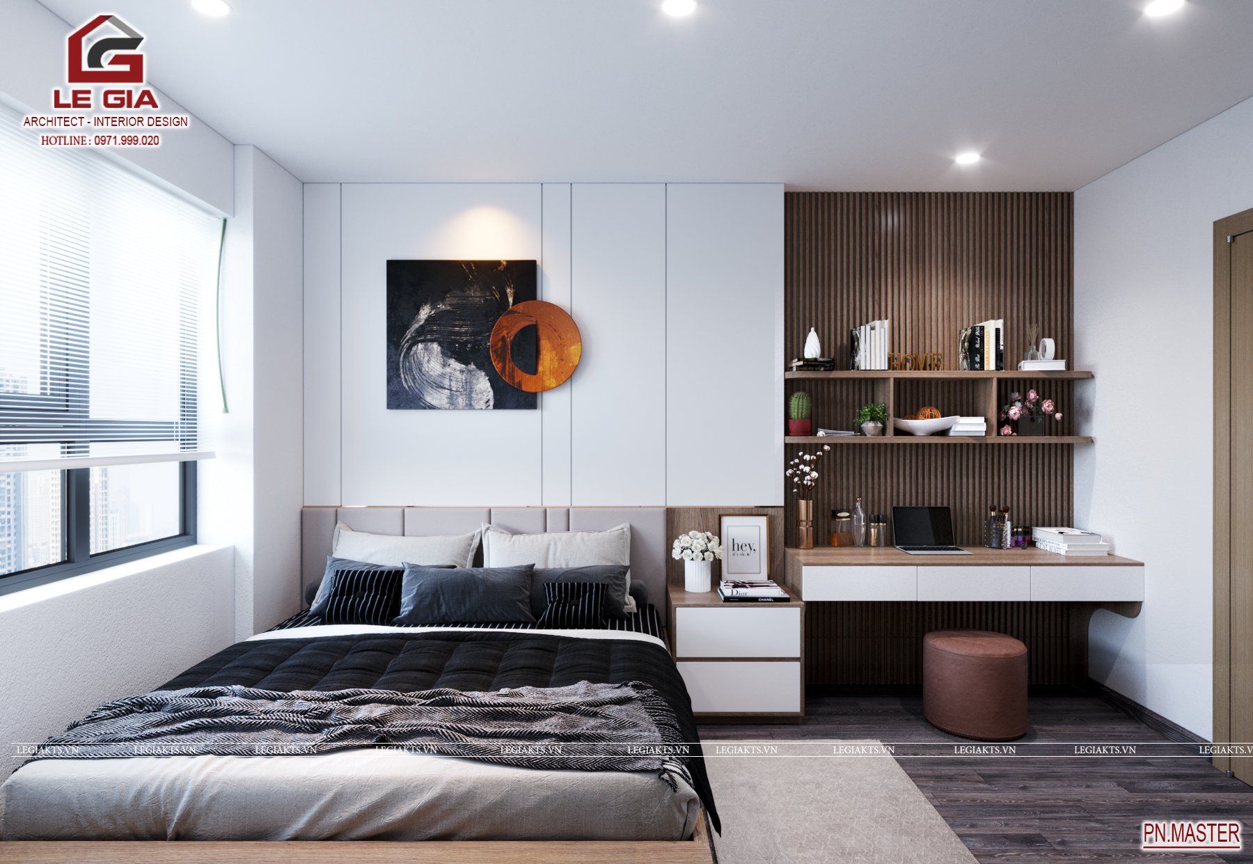 Phòng ngủ Master gồm giường, tab đầu giường và một bàn làm việc dài
