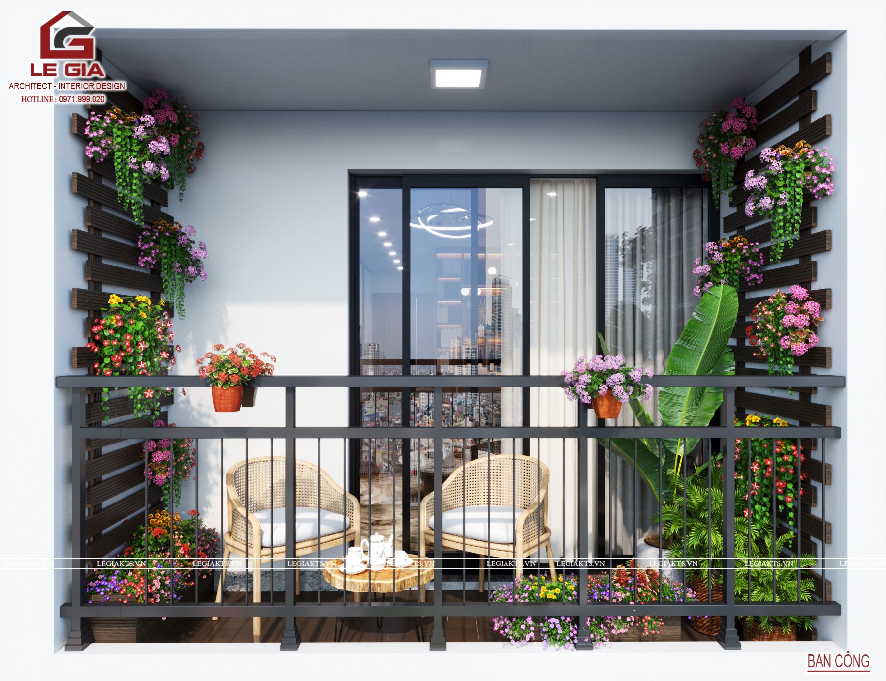 Ban công lát sàn nhựa giả gỗ, ốp nhựa giả gỗ 2 bên má cửa đi, treo các chậu cây để thêm khoảng không gian xanh tươi mát. Kết hợp với 2 chiếc ghế và bàn trà nhỏ tạo ra không gian thư giãn nhẹ nhàng vô cùng dễ chịu sau những giờ làm việc mệt mỏi bên ngoài.