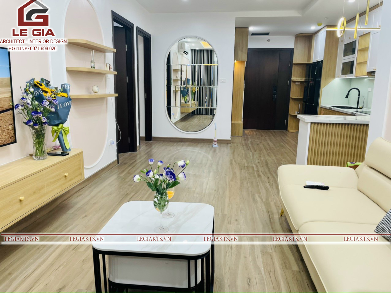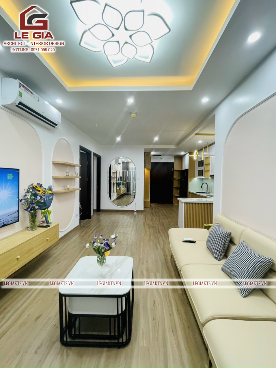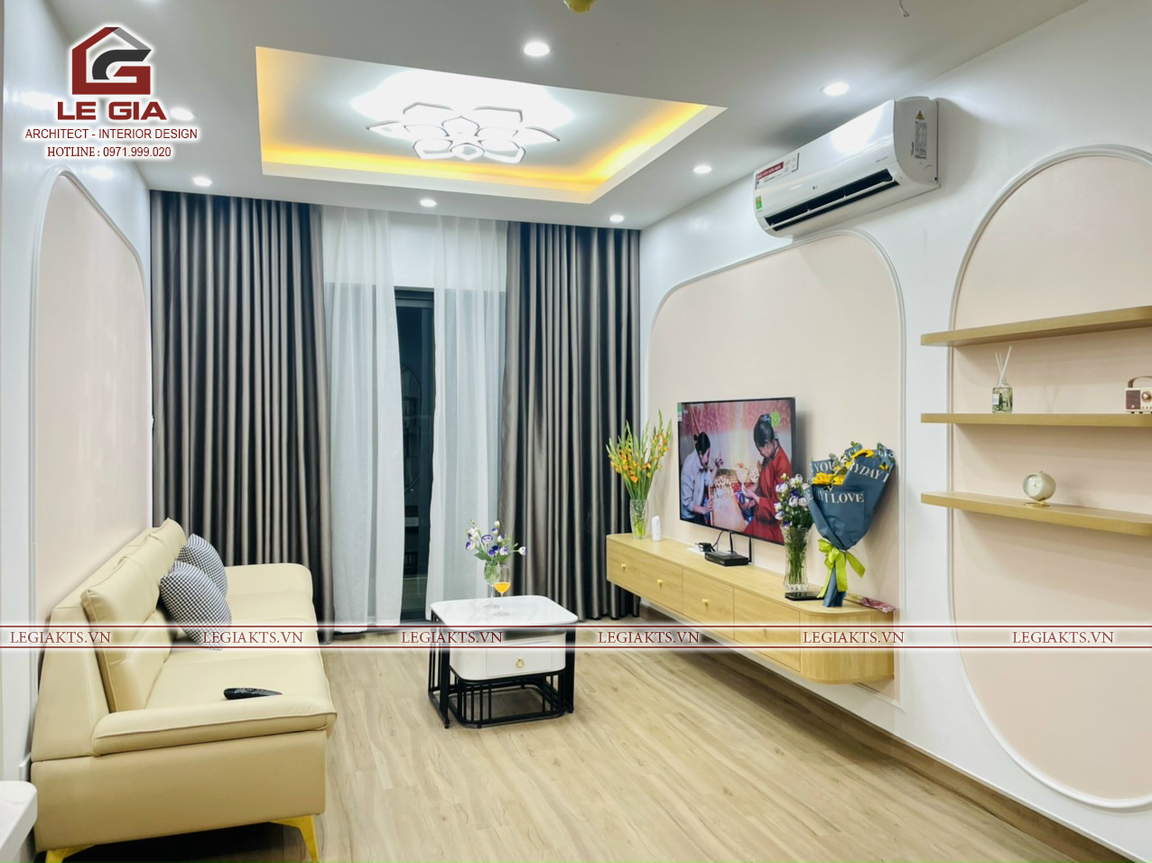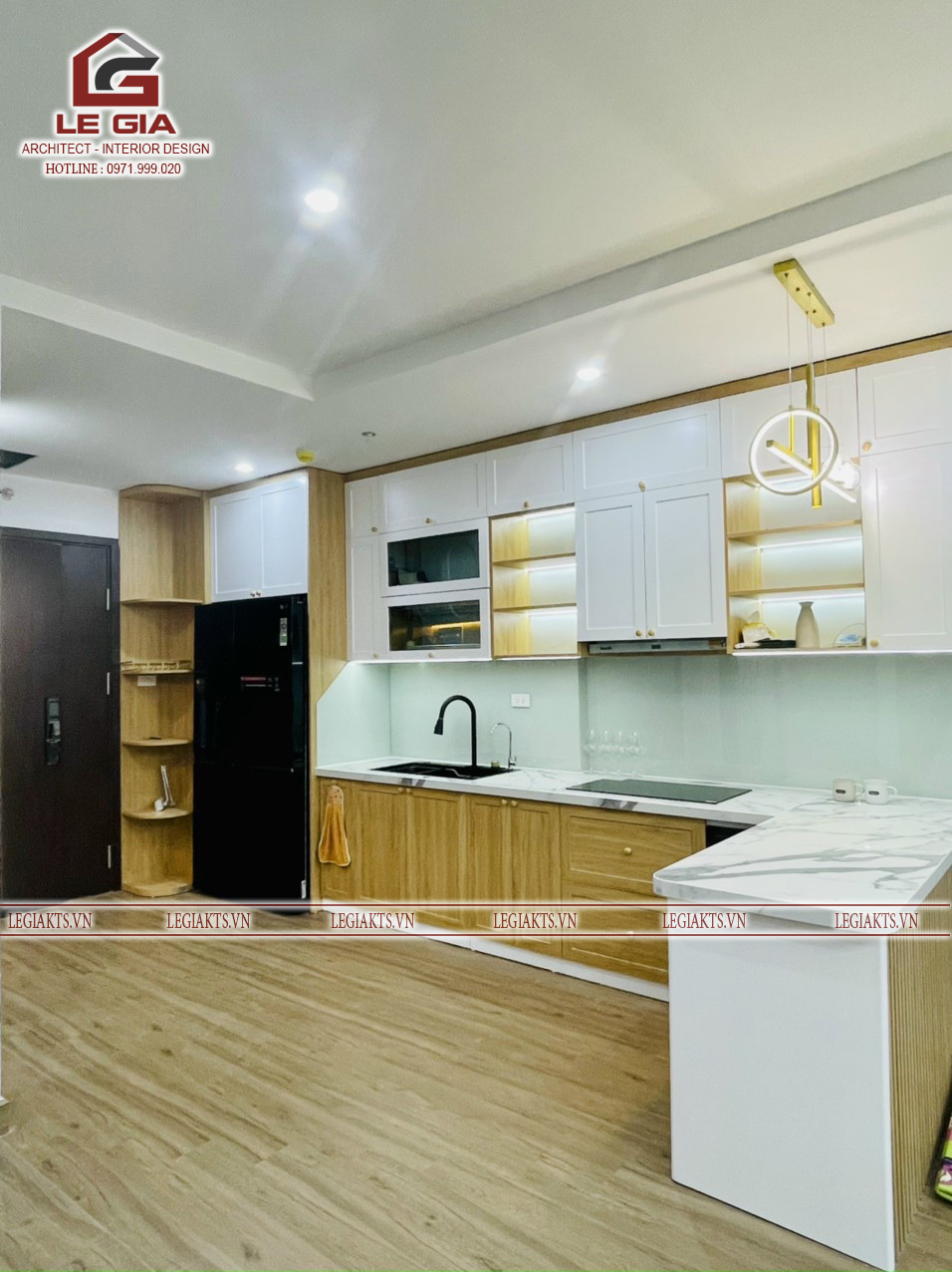Căn hộ này được KTS của Lê Gia thiết kế theo phong cách hiện đại. Chất liệu gỗ MDF cốt xanh chống ẩm sơn Inchem của Mỹ giúp nội thất bền màu với thời gian