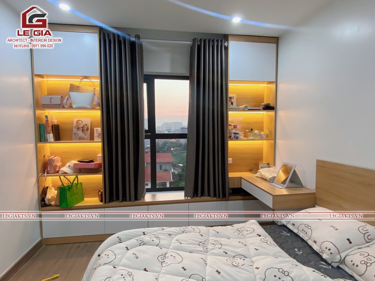 Phòng ngủ Master có giường tủ bàn phấn, sofa bed cạnh cửa sổ kết hợp tủ trang trí 2 bên để đồ deco, túi xách.....