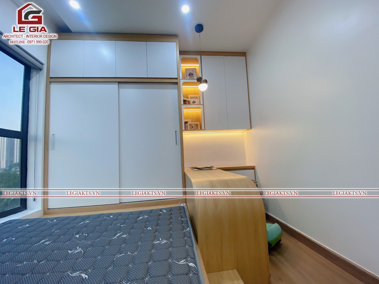 Phòng ngủ bé: KTS Lê Gia đã thiết kế giường kết hợp tủ áo để tạo thêm không gian lối đi phòng được rộng hơn. Thiết kế thêm bàn học và giá sách cho bé.