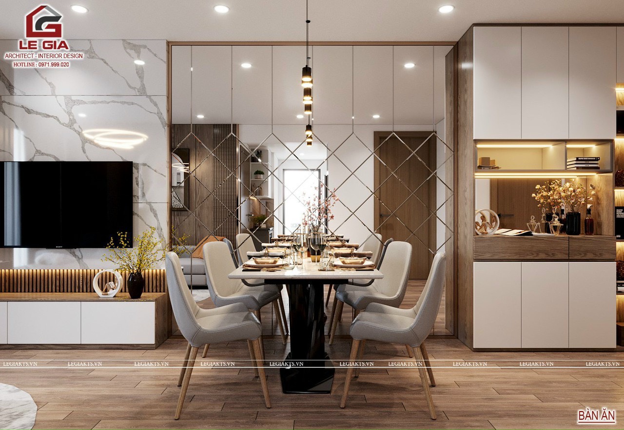 Khu vực bàn ăn có vách gương trang trí đánh lừa thi giác giúp không gian căn hộ được rộng hơn. Cạnh đó là tủ giày chất liệu sử dụng là MDF cốt xanh chống ẩm Thái Lan bề mặt phủ melamine