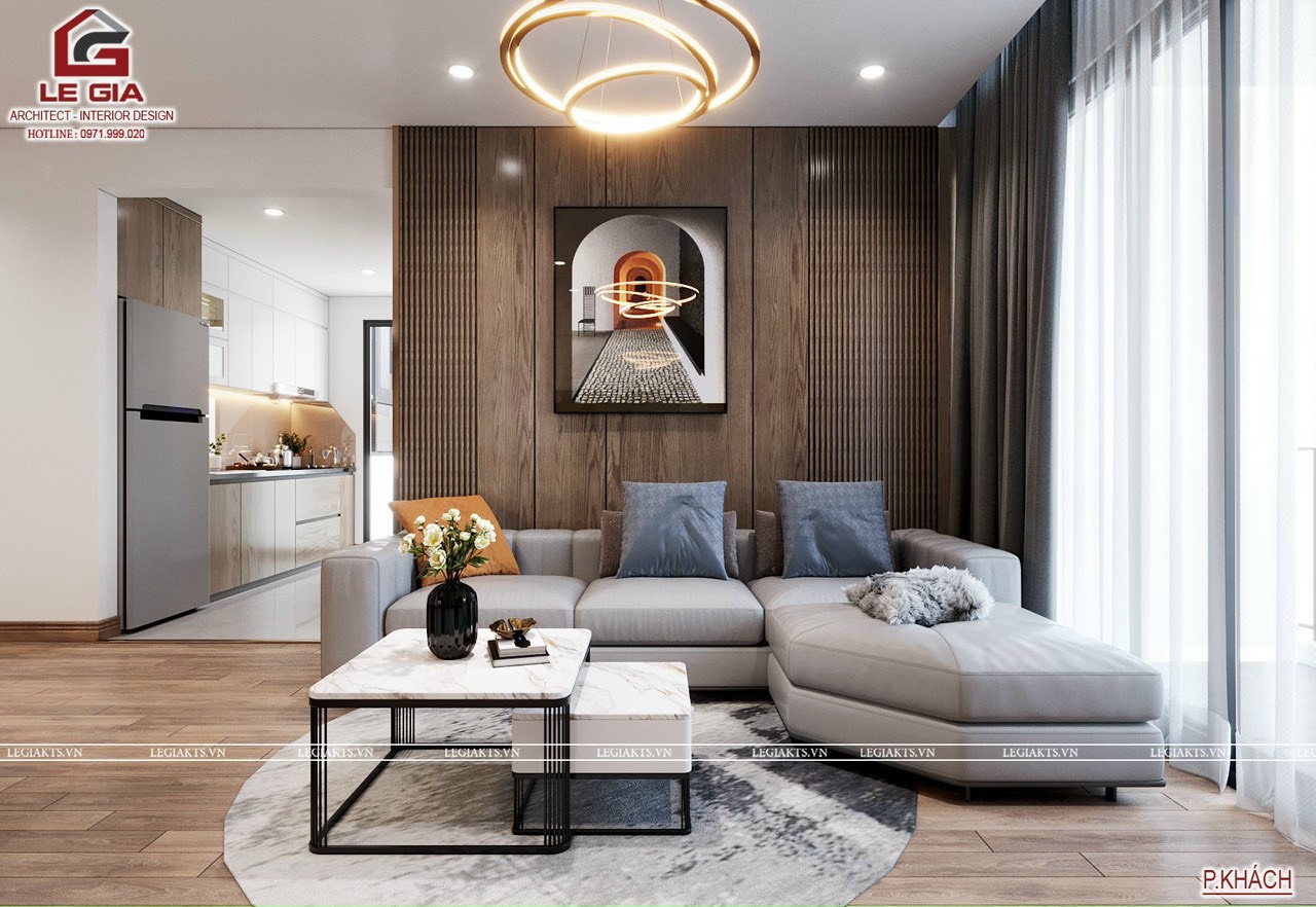 Sofa chữ L bọc da nhân tạo cao cấp, sau sofa là vách ốp phẳng + nan sóng trang trí gây ấn tượng với người nhìn ngay từ khi bước chân vào căn hộ.