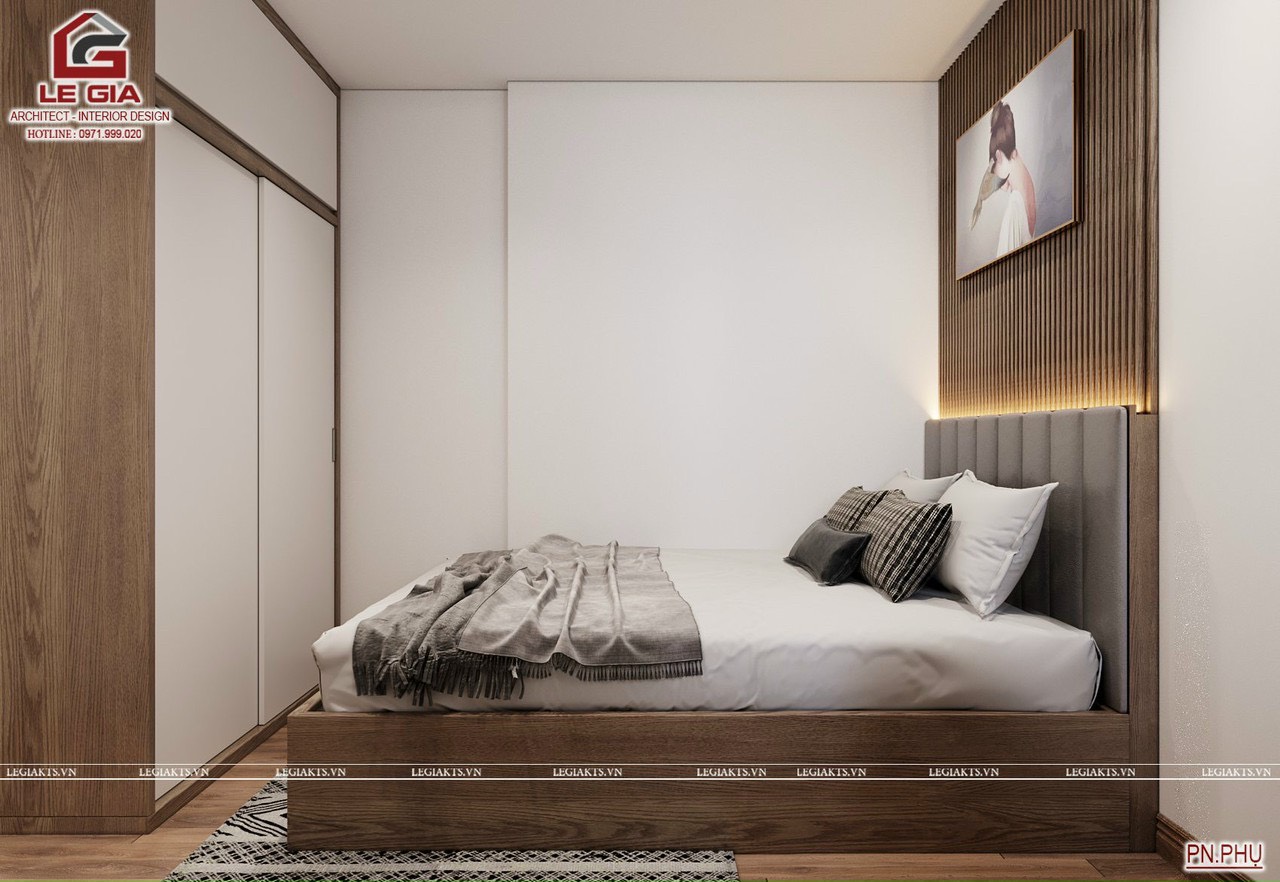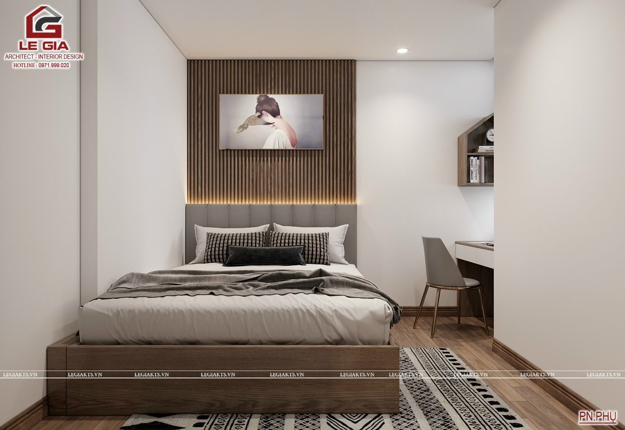 Phòng ngủ phụ; gồm giường ốp nan sóng sau giường có đèn led hất sáng tạo điểm nhấn. Khu vực bàn làm việc được thiết kế sát cửa sổ lấy ánh sáng và gió mát tự nhiên