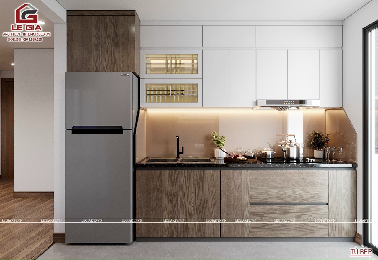 Tủ bếp cao kịch trần sử dụng 2 màu là màu trắng và màu gỗ hạt dẻ. Hộp tủ lạnh kích thước dài 70cm, cao 185cm phía trên là ngăn chứa đồ.