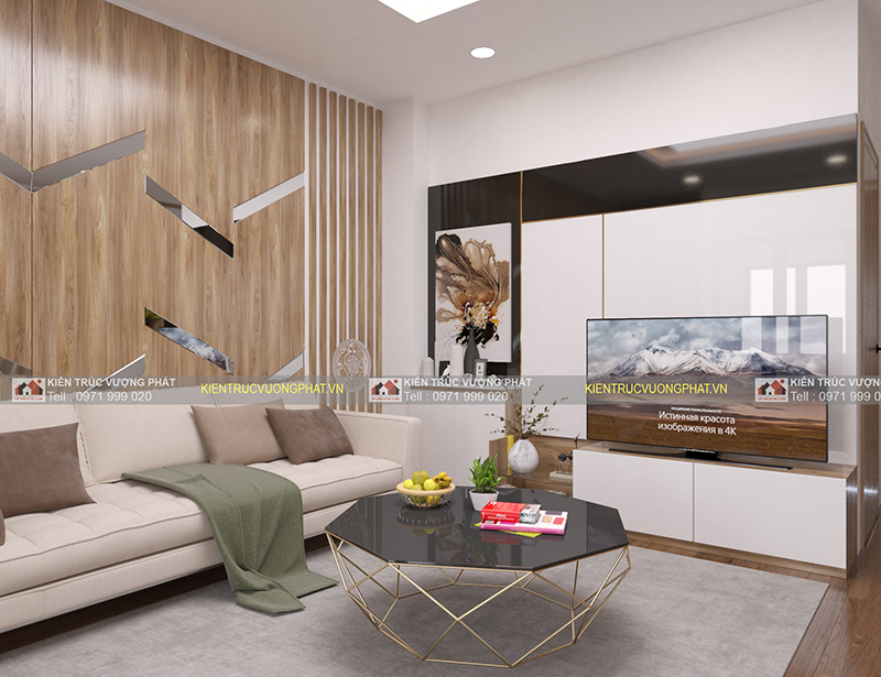 Bố trí phòng khách với bàn trà kim cương, chân bàn mạ vàng sang trọng
