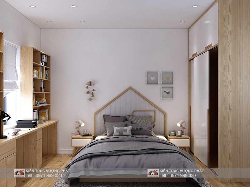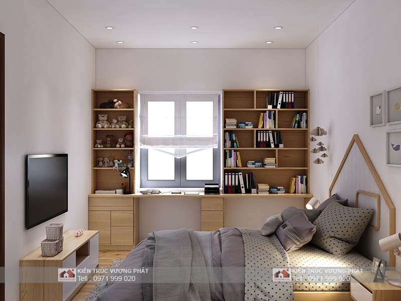 Phòng ngủ con gái lớn: được thiết kế theo phong cánh đơn giản nhưng vẫn mang nét trẻ thơ với giường tủ, và giá sách ngộ nghĩnh!