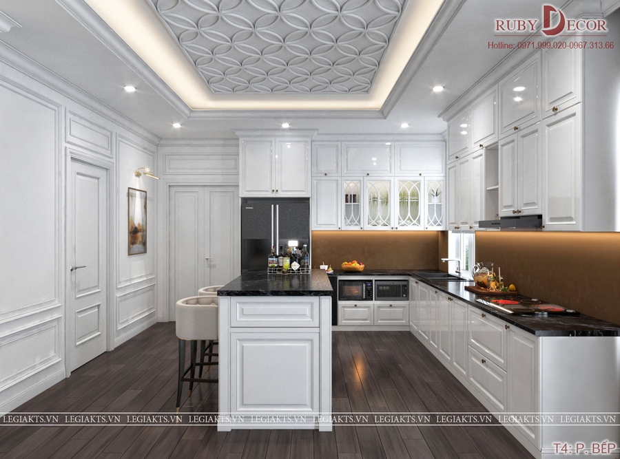 Tủ bếp gỗ gõ đỏ sơn trắng, bố trí thêm bàn đảo đầy tiện nghi.