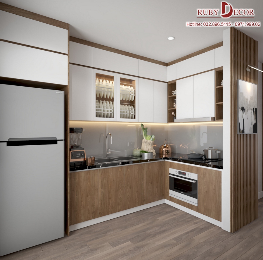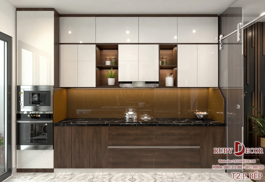 Tủ bếp chung cư rộng với tủ kho và lò nướng âm tủ