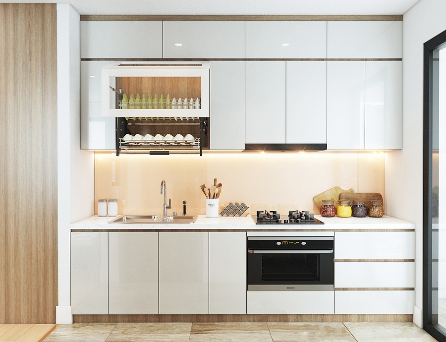 Thiết kế với đầy đủ phụ kiện tủ bếp đi kèm giá xoong nồi,giá dao thớt,giá bát di động ... tất cả hàng nhập khẩu chất lượng, đảm bảo độ bền dài lâu.